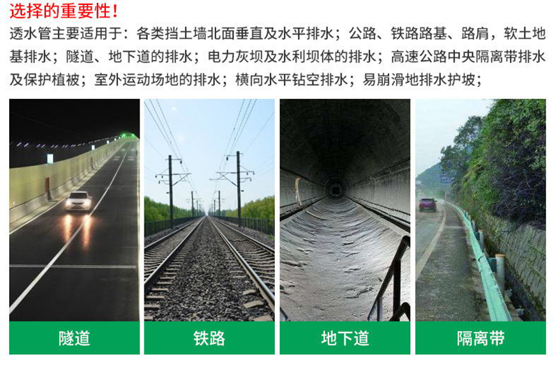 軟式透水管主要適用于:1)各類擋土墻背面垂直及水平排水;2)公路、鐵路路基、路肩,軟土地基排水;3)隧道、地下道的排水;4)電力灰壩及水利壩體的排水;5)高速公路中央隔離帶排水及保護(hù)植被;6)室外運(yùn)動(dòng)場地的排水;7)橫向水平鉆空排水;8)易崩滑地排水護(hù)坡;9)屋頂花園及花臺排水;10)山坡地水上保持11)整地工程的地下排水;12)低洼地排水及鹽堿地改造系統(tǒng)。